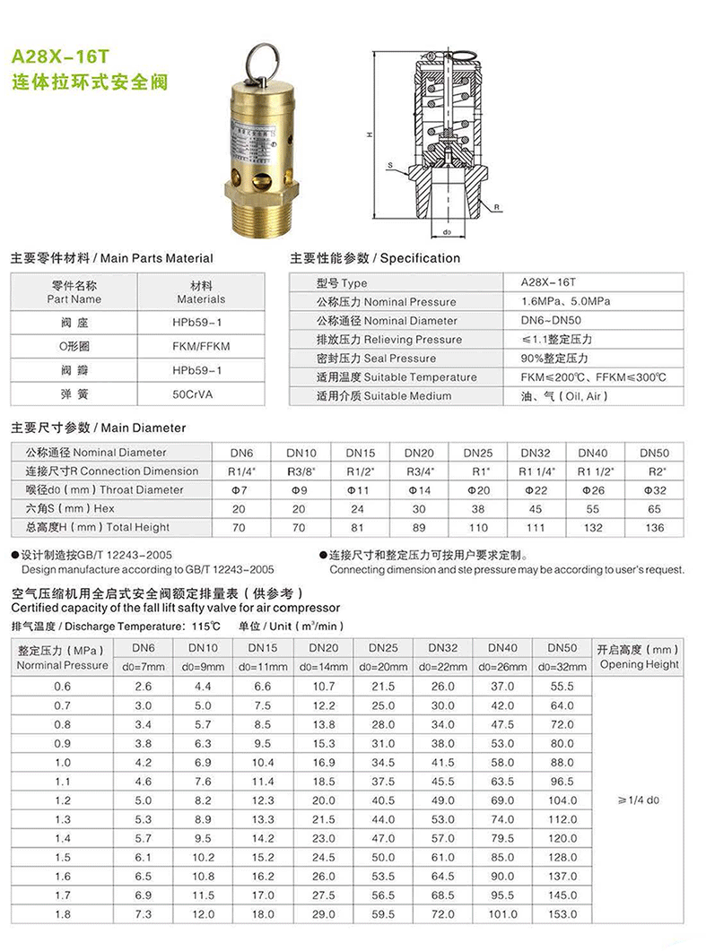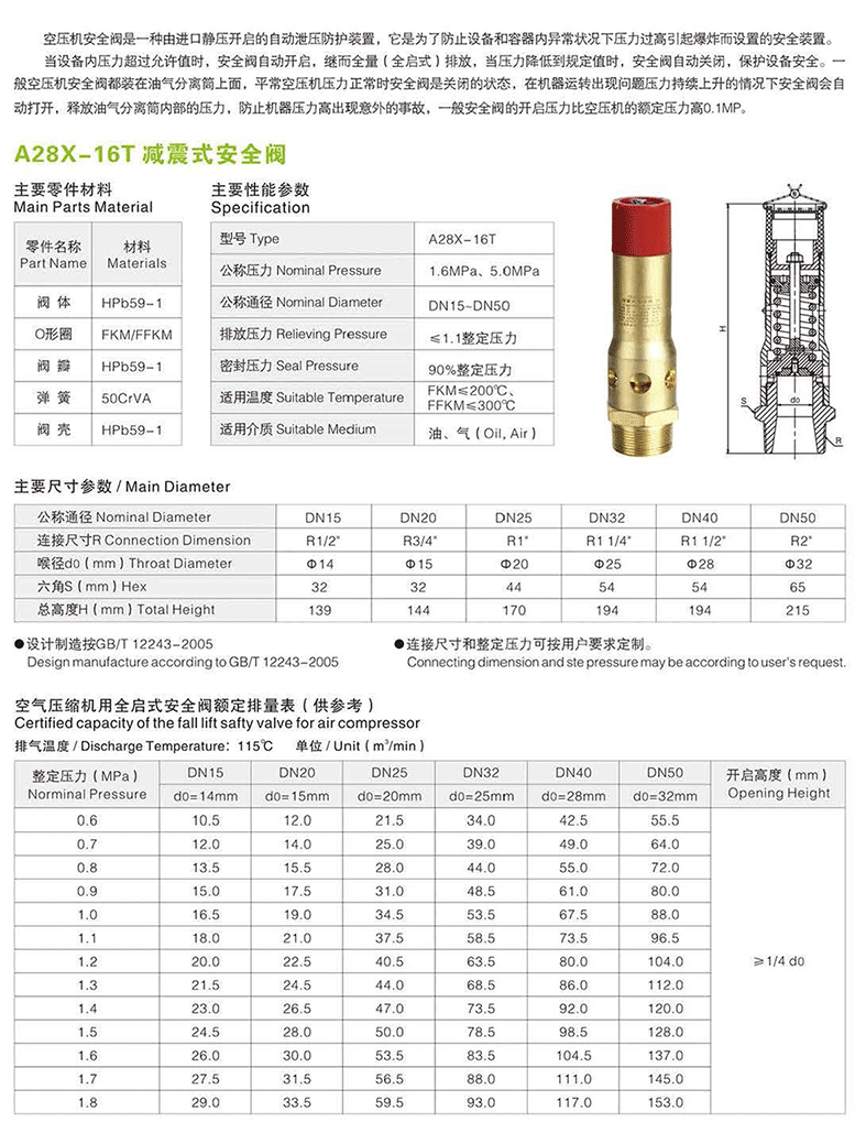 空压机安全阀是一种由进口静压开启的自动泄压防护装置,它是为了防止设备和容器内异常状况下压力过高引起爆炸而设置的安全装置。 当设备内压力超过允许值时, 安全阀自动开启,继而全量(全启式) 排放,当压力降低到规定值时, 安全阀自动关闭, 保护设备安全。一 般空压机安全阀都装在油气分离筒上面, 平常空压机压力正常时安全阀是关闭的状态,在机器运转出现问题压力持续上升的情况下安全阀会自 动打开,释放油气分离筒内部的压力,防止机器压力高出现意外的事故, 一般安全阀的开启压力比空庄机的额定压力高0.1 MPa.